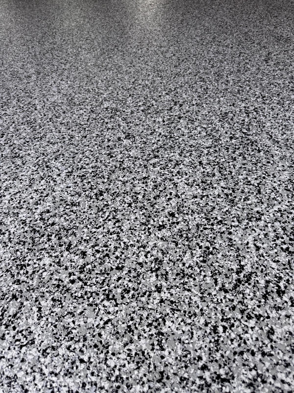 Flake epoxy flooring is one of the most versatile and customizable options for both residential and commercial spaces. It’s created by broadcasting decorative vinyl flakes over a base epoxy coat, then sealing it with a durable topcoat. The result is a textured, slip-resistant surface that hides imperfections while adding depth and color. Available in endless color combinations, flake epoxy can mimic natural stone, terrazzo, or custom brand colors. It’s perfect for garages, basements, retail spaces, and warehouses that need a durable yet attractive finish. This type of flooring is UV-resistant, easy to maintain, and built to withstand impact, moisture, and chemicals — making it a smart, stylish investment that holds up beautifully over time.
